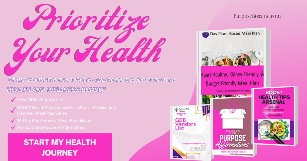 BOOST Health Tips Arsinal Mini eBook - Passion And Purpose - Meal Plan Series: Based on our "14-Day Heart-Healthy, Kidney-Friendly, and Budget-Friendly Meal Plan". It's PACKED full of all the health gems and tips learned during the author's health journey to initially loose 85lbs.